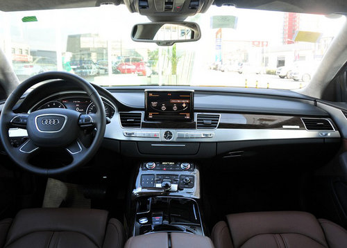 拉开车门,我发现新A8L 在内饰整体设计上也出现了巨大的突破,中控台从前一直延伸至后排座椅,上面精巧的换挡杆造型被官方称为游艇的推力杆。"包裹设计"理念首次被奥迪所使用,一道优雅的弧线将整个仪表盘收纳其中。至于内饰用料和工艺你根本不用操心,凡是能用手摸到的地方都是由真皮、实木和亚光金属件覆盖的,手感上乘。