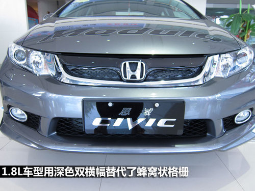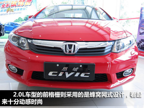 东风本田新款思域的外观采用了概念车CR-Z的设计元素,运动型前包围十分醒目,展现动感的同时带来了十足的冲击力。新思域格栅也经过了重新设计,1.8L车型的前格栅采用的是双幅横格式设计,而2.0L车型的前格栅则采用的是蜂窝网式设计,看起来十分动感和时尚。