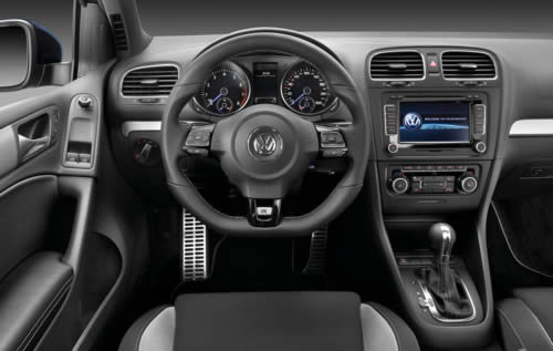 如果说红色的缝线让GTI迫不及待地亮出了自己的身份,而高尔夫R的白色缝线就显然不具备这样的视觉冲击力。如果不是那个异样的变速箱挡杆和带有“R标识”的多功能方向盘,很容易认为这是一台高尔夫6的内饰。高尔夫R采用了高档真皮赛车座椅设计,包裹性很强,同时真皮座椅能够提供完美的腰部和背部支撑,而座椅中央的翻皮设计也能够为激烈驾驶提供足够的摩擦力。高尔夫R的多功能方向盘是很多车迷的最爱,低调的“R”车标,黑色烤漆装饰恰到好处,平底的设计,后藏换挡拨片以及拇指处的凹陷设计都显示了这款方向盘的运动基因。蓝色的指针彰显了高尔夫R独特的品味,而最高时速300km/h的刻度,似乎在不经意间泄露了这台高尔夫的真正实力。