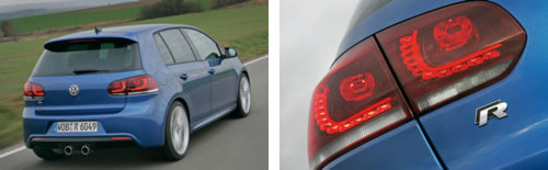 采用了新家族式前脸的高尔夫R依然是一脸的低调,与小弟GTI相比,进气格栅由带有红线的蜂窝状回归了传统的横条状,不过钢琴烤漆的采用暗示着这不是一台普通的高尔夫。而一个不起眼的R徽标更是明确地告知了它的身份。高尔夫R采用了类似奥迪R8的下进气格栅设计,不过这样的设计并不是为了虚张声势,而确实是需要向270匹马力的涡轮增压引擎提供足够的空气。高尔夫R采用了中置式排气管设计,这也是R系列车型的标志性设计之一。高尔夫R采用了225/40 R18的邓禄普轮胎,而尺寸更大的235/35 R19轮胎被列为选装配置。高尔夫R的尾部比GTI更加简洁,连徽标也仅仅只是一个简单的“R”字母就完事,主要的区别体现在保险杠部分,高尔夫R为中置式排气管设计,更有跑车的味道。