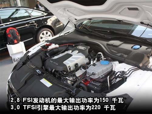 2.8升FSI直喷V6引擎的动力调教要高于现款A8L入门车款的动力调教,2.8 FSI发动机的最大输出功率为150 千瓦,在每分钟3,000到5,000转的发动机转速区间内均能输出280牛•米的峰值扭矩。另一款3.0 TFSI引擎最大输出功率为220 千瓦在2,900 转/分钟时便可获得440 牛•米的峰值扭矩。在quattro全时四轮驱动系统和S tronic双离合自动变速器的协同工作下,从静止加速到100公里/小时仅需5.6秒(官方数据)