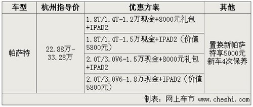 【杭州网上车市讯】 新帕萨特是上海大众全新推出的一款中高级车型,上市以来立刻吸引了消费者的眼球,成为又一款热销的中高级车型。近日本站从杭州申华汽车获悉,全新帕萨特杭州报价22.88万-33.28万,12月9日,推出4种优惠方案,一、1.8T/1.4T-1.2万现金+8000元礼包+IPAD2;二、1.8T/1.4T-1.5万现金+IPAD2(价值5800元);三、2.0T/3.0V6-1.5万现金+8000元礼包+IPAD2 ;四、2.0T/3.0V6-1.8万现金+IPAD2(价值5800元)。具体车型价格见下表:
