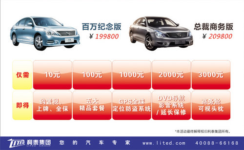 (1)天籁百万纪念版¥199800元起。+10元:即享购置税、上牌费、全保;+100元:轻松拥有五件套;+1000元:GPS全球定位系统等你拿;+2000元:DVD导航影音系统带回家;+3000元:再赠送可视头枕。