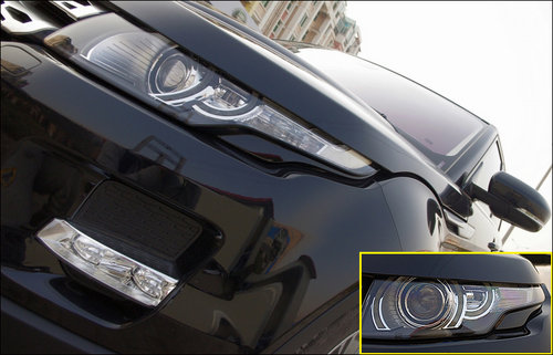 极光的大灯造型很时尚,明显区别于揽胜旧有的板正造型。双眼狭长,眼角斜挑,很犀利。