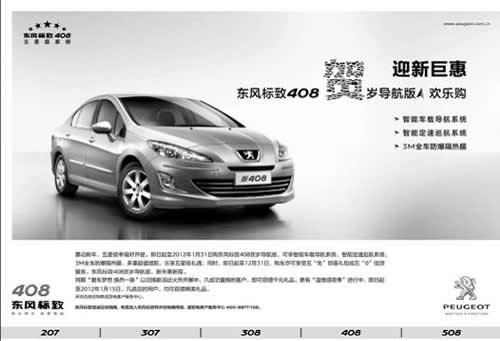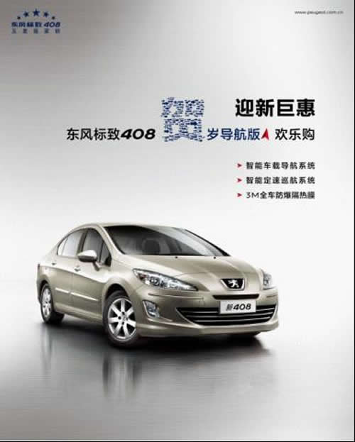 【青岛网上车市讯】即日起至2012年1月31日,迎新巨惠,东风标致408新推出贺岁导航版倾情促销!新增配了智能车载导航系统、智能定速巡航系统、3M全车防爆隔热膜等诸多超值配置。圣诞、元旦、除夕未至,五星级家轿开始悄然主演车市版贺岁片《甲方乙方》。