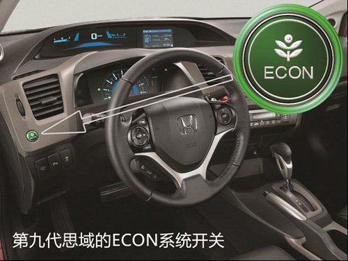 在第九代思域的方向盘左侧,编辑看到了一个绿色的按钮,这个按钮就是ECON系统的,也就是节能支持系统,这也是Honda第一次在中国市场的投放车型中标配这种系统。