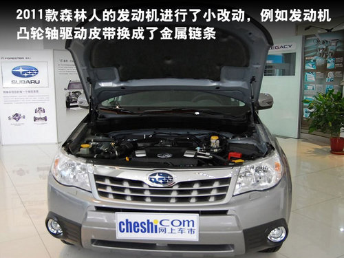 2011款森林人的发动机进行了小改动,例如发动机凸轮轴驱动皮带换成了金属链条,其中 2.5T全新的涡轮增压2.5升DOHC水平对置四缸发动机,最大功率为230马力,最大扭矩达到330N•m。虽然动力上没有太大的提升,但新发动机的燃油经济性得到了10%的提升,官方城市/高速工况下的百公里油耗分别达到11.2/8.7升。配置方面,2011款森林人将蓝牙免提作为全系标准配置, 而可以连接iPod和卫星收音机的6声道音响系统则成为森林人2.5X和2.5XT的标配。此外,2011款森林人还配备了可自动调整的氙气前大灯。