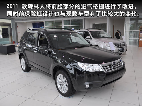 2011 款森林人将前脸部分的进气格栅进行了改进,同时前保险杠设计也与现款车型有了比较大的变化。将蓝牙免提作为全系标准配置,而可以连接iPod和卫星收音机 的6声道音响系统则成为森林人2.5X和2.5XT的标配。此外,2011款森林人还配备了可自动调整的氙气前大灯。