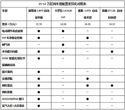 由于本次对比的车型车款众多(卡罗拉全系多大21款),我们选择了4款车型动力接近,价格接近的15~16万元车型进行详细的配置差异对比。
