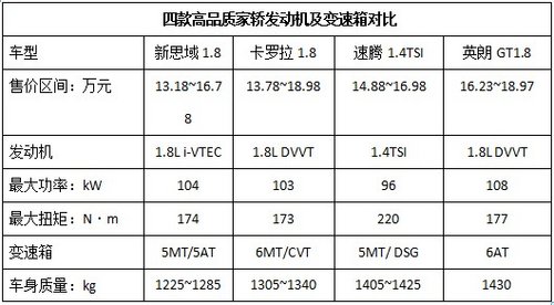 从上面的表格中不难发现,4款车的主流动力单元参数非常接近,只有速腾的1.4TSI发动机由于先天排量略低,在最大功率方面略显不足,但速腾因为涡轮的作用,在扭矩方面又找回了优势。剩下的三台自然吸气发动机中,英朗GT的1.8L DVVT在动力方面略微突出,但净重却比动力水平排名紧随其后的新思域多出了近200kg——几乎相当于3个成年男性的体重——这多出来的4kw功率和4Nm扭矩相对于多出的负载来说几乎是杯水车薪。综合来看四款车型动力差别不大,而且在同级别车型中都还有一些优势。
