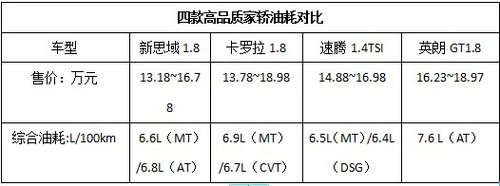 动力不是问题,但作为家用轿车油耗也是不得不仔细考察的现实问题,油耗对比中,新思域、卡罗拉和速腾,工信部公布的百公里综合油耗都在6.5~7.0L之间,百公里油耗令人满意。而英朗GT 7.6L的百公里油耗,已经与很多2.0L的车型不相上下,在油耗的对比中被其他三款远远的抛在了身后。值得注意的是,速腾的油耗表面上略低,但因其采用涡轮增压发动机,速腾的1.4TSI车型在保养费用,保养周期和耐用度可靠性方面,相对于自然吸气发动机略显不足。新思域的油耗不仅专业测试的数据低,实际驾驶中其拥有ECON智能化绿色节能辅助系统,可以帮助车主智慧的达到省油的效果,其它三款车型则缺失这项功能,实际油耗会受到车主驾驶风格的影响,油耗呈现不稳定。从实际角度出发,新思域相对其他三款车型在动力性,经济性,稳定性和耐用度方面更加均衡。