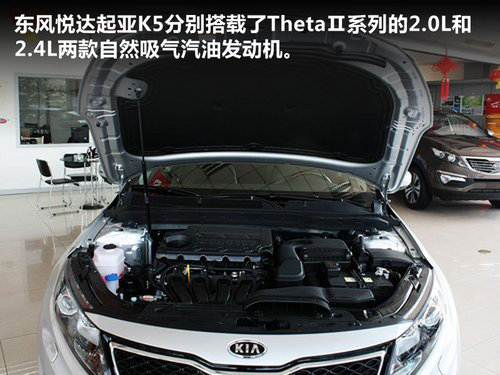 东风悦达起亚K5分别搭载了ThetaⅡ系列的2.0L和2.4L两款自然吸气汽油发动机。 2.0L发动机最大功率为165马力,最大扭矩为 198Nm;2.4L发动机的最大功率为179马力,最大扭矩为231Nm。与其配备的是6挡手动和6速手自一体变速器,全新研发的变速器不仅加速更加迅 猛,还提高了燃油经济性。
