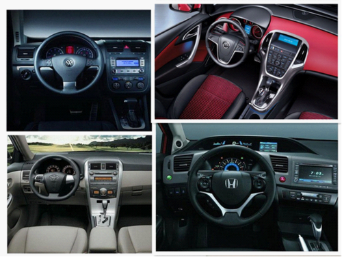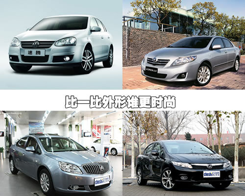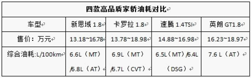 从上表不难看出,虽然4款车型的动力水平已经相当。但配置差异明显,呈现三个等级,英朗GT1.8L 自动时尚型配置最低,基本的电动真皮座椅、ESP电控车身稳定系统都缺失;卡罗拉和速腾配置相当但依然有明显缺失,卡罗拉1.8 GLXi CVT虽有真皮座椅但无ESP电控车身稳定系统,速腾 1.4TSI 自动技术型则反过来有ESP无电控真皮座椅,新思域的配置最高,电动真皮座椅、ESP电控车身稳定系统、多功能方向盘、倒车影像、氙气大灯统统匹配,此外本次新思域还有一项全新的独家智能高科技配置:ECON智能化绿色节能辅助系统,只要打开ECON系统,车辆便自动进入优先控制油耗模式,通过控制节气门开合与智能调节空调工况,并通过仪表的颜色变化来改善驾驶者的不良习惯达到节省燃油的目的。从对比中可以看出新思域各项配置实用且全面,而新思域的价格又是四款相近价位档中最低的,配置性价比高,看来最新上市的车型就是有优势,颇有一骑绝尘的气势。