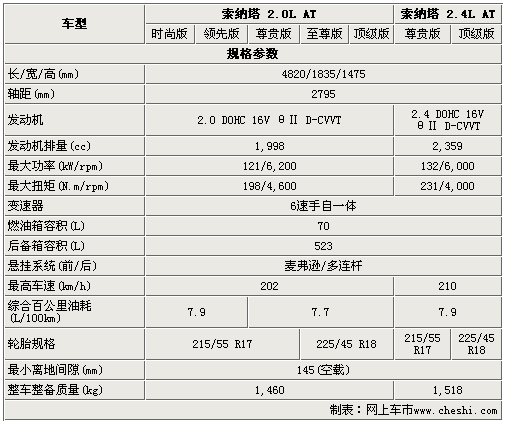 第八代索纳塔在各个方面都给人一种焕然一新的感觉,将固态的坚固感与液体的流动感完美的融合在一起,形成独特的流体雕塑风格。在外观尺寸方面长/宽/高(mm)分别为4820/1835/1475,轴距为2795mm,很好的保证了内部空间。动力上第八代索纳塔搭载了2.0L和2.4L两种排量的双顶置凸轮轴发动机,其中2.0L发动机最大功率与最大扭矩分别为121KW和198NM,而搭载2.4L发动机的两款车最大功率与最大扭距达到了132KW和231NM,较老款并无明显提升,全系匹配了6速手自一体变速器,很好的保证了动力的输出。