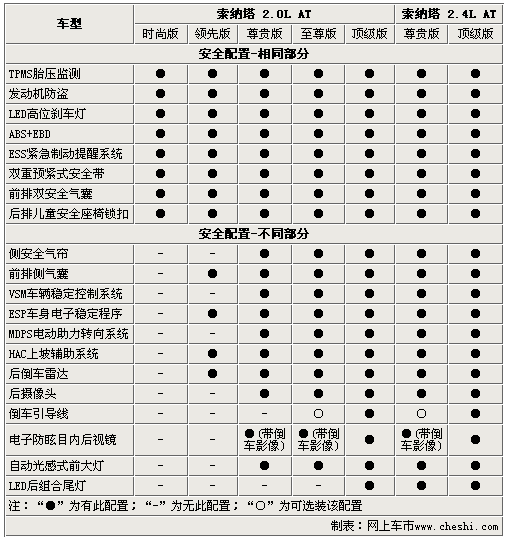 安全配置部分—2.0L时尚版与领先版无侧气囊、ESP、倒车雷达、自动感光式前大灯、LED尾灯