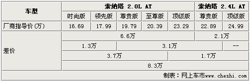 北京现代第八代索纳塔,售价为16.69-24.99万元。这款索纳塔全新换代车型搭载2.0L和2.4L两款引擎,按配置及动力共分为7款车型。其中2.0L 自动时尚版与2.4L 自动顶级版差价达到了8.3万元,价格最低的时尚版仅为16.69万元,但低配车型各方面的不给力不免让人感到有些吃“惊”,源于高性价比的“喜”也随之消失,下面就让我们共同来了解下全系各个版本配置上的差异。