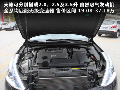 目前在二十几万元的价格区间内,仍只有新天籁和锐志搭载了V6发动机。发动机舱布局比较规整,但是手动撑杆出现在这个价位的车型上却有些令人不能理解,目前这个级别的车型似乎只有新天籁和蒙迪欧致胜是这种情况。不过,值得欣喜的是在新天籁上4AT已成为历史,与V6发动机相匹配的换成了更为先进的带六速手动模式CVT变速箱。