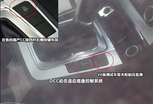 从此次曝光的谍照来看,我们能够明显的在排挡杆右侧找到“DCC动态适应底盘控制系统”按键,这项配置目前仅配备在进口CC上,而在售的国产CC中尚未装 备。DCC动态适应底盘控制系统,通过调节,可以带来舒适、运动等模式,为用户带来更好的驾驶体验。另外,目前在售的一汽-大众CC均标配了胎压监测系 统,其按键就位于排挡杆右侧的第一个,而通过谍照来看,V6版CC排挡杆右侧同样位置则为空的,或许是因为试验车,其还未装配上胎压监测。