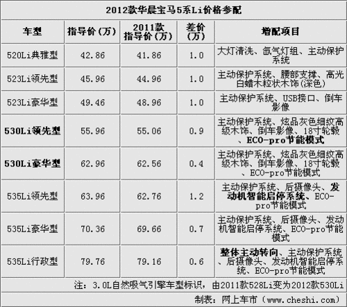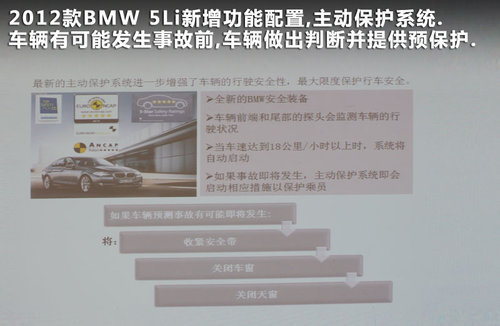 全新的华晨宝马5系长轴距版,作为一款外形更商务沉稳的5系得到了国人的认可,上市后的销量一直保持强势,在11款后又推出了增加配置的2012款车型,外形基本没有变化,主要是对配置进行调整。增加主动安全配置(主动安全系统),全系标配氙气灯组和ECO节能驾驶模式和发动机智能启停,售价相对2011款有提高。