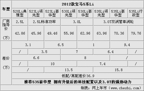 1.如果您很在意科技豪华配置我们推荐535Li行政版车型,带行人识别夜视系统、车道偏离警告、平视显示、自动泊车入位、前排通风座椅、哈曼卡顿扬声器、后座视频系统。2.如果您的预算充足我们推荐最适合的535Li豪华型,相比535Li领先得到了更多的科技配置,535Li豪华型拥有:“智能启停”,“ECO节能驾驶模式”、“后排液晶屏"、"自动泊车系统"是这4项增配功能里最便宜的车型。大部分舒适和科技配置都拥有包括iDrive系统和后排液晶屏。3.0T在排量上与3.0相同而且动力更加强大!3.中档配置预算在50万区间推荐530Li领先型,最低价格拥有ECO节能模式车型,倒车影像很实用的。4.预算有限的用户可以选择520Li车型相比523Li差价3.1万,但是多出的豪华配置并不多都没有iDrive导航功能,而且增配款的520Li增加了氙气灯组和主动安全系统性价比更高。