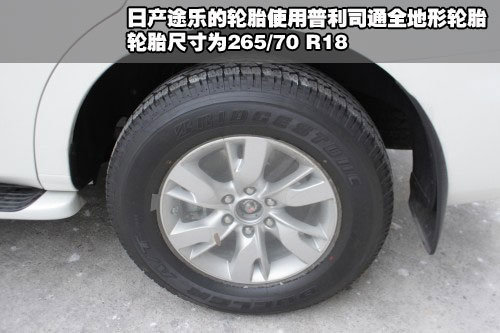日产途乐的轮胎使用普利司通全地形轮胎,轮胎尺寸为265/70 R18。途乐采用了4活塞卡钳高性能前制动系统,大大提升了途乐的安全性能。