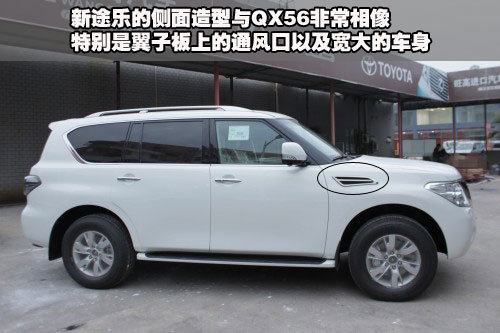 新途乐的侧面造型与QX56非常相像,特别是翼子板上的通风口以及宽大的车身。