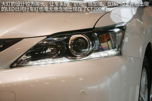 CT200h大灯设计犀利扁平,一撇ES等车型中庸的风格。在其高配车型上出现了LED日间行车灯,虽然这个功能在中国更多的是被用来区分高低配或豪华车的标志,不过确实这个功能在白天有着非常良好的警示功能。