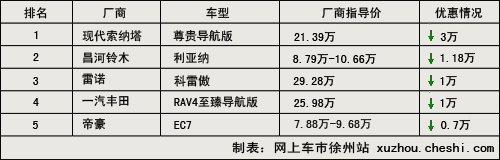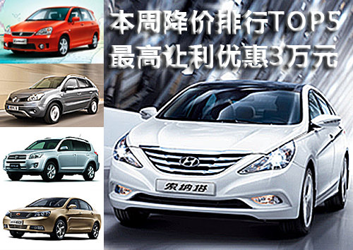 【网上车市-徐州讯】:年关将至,进入1月的第三周,网上车市为您总结了本周降价排行榜。本周现代索纳塔尊贵导航版最高优惠3万,占据排行榜第一名。下面我们是为网友们提供降幅最大的5款车型,具体详情请见下表: