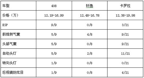 通过表格不难发现,在安全配置上轩逸相对显得落后,408稍稍领先卡罗拉。价格上低配408较低、高配轩逸较低,两款车型基本持平,卡罗拉价格比之另外两款稍高。