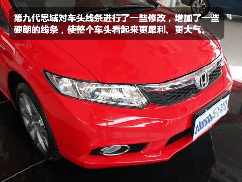 第一眼看到第九代思域的前脸,感觉与老款没有什么变化,看来经过六年的洗礼,厂家认为思域的经典时尚造型依然具有足够的吸引力。不过与老款稍微对比,就会发现还是有新的突破,比如现在看老款就感觉有些偏重女性化,尤其是线条平滑的车头,第九代思域对车头线条进行了修改,增加了硬朗的棱角,看起来更加犀利,也更大气。