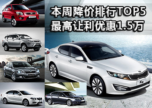网上车市-徐州讯】:进入2月的第四周,网上车市为您总结了本周降价排行榜,东风悦达起亚起亚K5现金优惠1.5万元,狮跑现金优惠1万元,占据排行榜第一名。下面是我们为网友们提供降幅最大的5款车型,具体详情请见下表:
