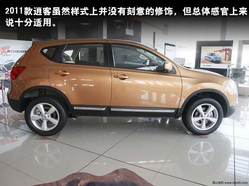 2011款逍客进气格栅由原先的哑光横条状变换为粗犷的蜂窝并用镀铬装饰条进行了钩边处理,侧面更精干的造型也形成了对运动的诉求,顶配车型所配备的17寸轮毂采用了5幅式的设计,虽然样式上并没有刻意的修饰,但总体感官上来说十分适用。2011款逍客还增加了全景式天窗,将近1平方米的大尺寸全景天窗,使得乘客和驾驶者有更广阔、更通透的驾乘感受,而全景式天窗更大的作用是提高了车内的透光率,可以很好的缓解车内的压迫感。