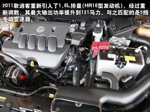 2011款逍客重新引入了1.6L排量(HR16型发动机),经过重新调教,其最大输出功率提升到121马力,与之匹配的是5挡手动变速器。其余四款车型搭载的则是2.0L MR20发动机,最大功率为145马力,与之搭配的是6速手动变速箱和CVT变速箱。内饰方面,2011款逍客的内饰沿用了老款的整体设计,但在功能性方面进一步的提升,例如中控台上方的欧式液晶屏、添加了Carwings行车远程帮助系统、更多信息化仪表盘等。
