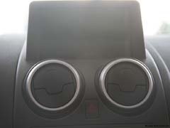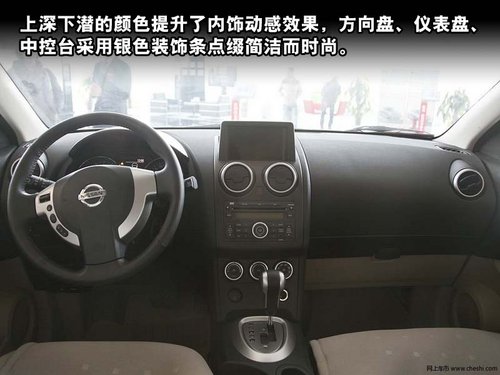 逍客的内饰带有明显的日产家族风格,中控台和日产奇骏非常相似,让我们非常熟悉,上深下潜的颜色提升了内饰动感效果,方向盘、仪表盘、中控台采用银色装饰条点缀简洁而时尚。三幅式的方向盘左上策侧为多媒体控制区域,调节音轨采用拨片的方式,操作起来很方便。仪表盘周围用铝制装饰,现代感十足。中控台面板布局简洁时尚,圆形的出风口设计,看起来像是两只大眼睛,可以360旋转出风角度,还有专门的车顶出风按钮,很能讨女性消费者青睐。音响控制面板按键,和自动空调旋钮,阻尼感非常好,又不至于特别紧,档位也很清晰。