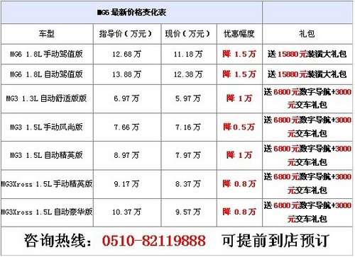 【网上车市无锡站资讯】3月16日-18日,2012无锡电视台春季电视购车节即将盛情登场,届时,上汽MG将携MG 3和MG6闪亮出现!现MG6全系现金优惠15000元,另赠价值15880元装潢礼包(仅限10台)。MG3现金优惠10000万元,另赠价值6800数字导航和3000元交车礼(仅限10台)。可提前到店预定,MG6、MG3店内现车充足,欢迎感兴趣的朋友致电或到店详细了解。 咨询热线:0510-8211988 公司地址:无锡市江海路永乐东路交叉口(广南立交桥西侧)