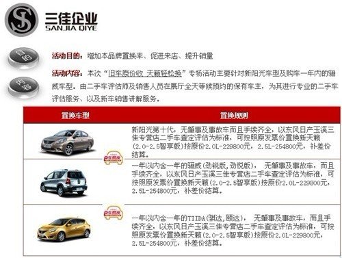 【网上车市玉溪站讯】日前,网上车市编辑了解到,即日起至4月30日,东风日产玉溪三佳专营店面向广大客户发出置换召集令:新阳光、两年内购买的骐达、骊威,(注:无事故)可按原购车发票金额置换新天籁,其余品牌车型可通过东风日产“车易换”业务到店置换任一东风日产车型;此外,凡在活动期间,成功置换任一款车型的客户均可享受置换大礼包。