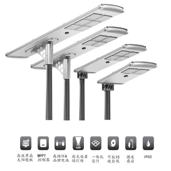 PAD款一体化太阳能路灯采用高效单晶光伏板,智能MPPT控制器,长寿命磷酸铁锂电池,高光效LED灯珠,集于一体化设计,安装使用方便。