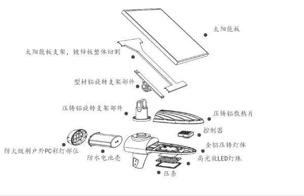 - 专业工业设计团队设计,集太阳能板,光源,控制器,电池,人体感应于一体