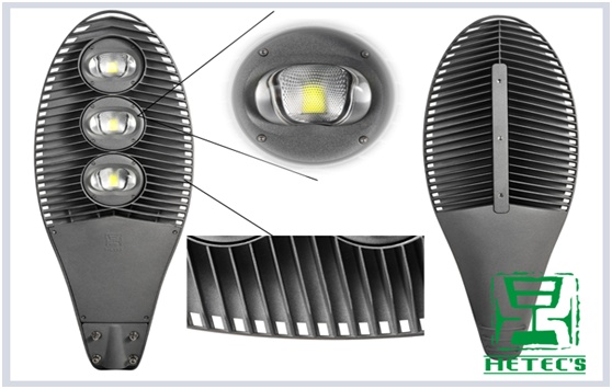 第二,在散热解决方面,灯壳采用压铸铝合金材料做灯具散热器,散热器整体导热能力比普通铝合金提高2倍以上,使LED热量能导得快、散得快,解决了大功率LED灯具的散热难题;散热器与灯壳一体化的单片式散热结构,散热片完全裸露在环境空气中,无蓄热空腔存在,鳍片散热器结构,保证了散热片与空气的直接接触面积,整体设计完全保证了铝基板温度不超过65℃,灯具温差不超过50℃。